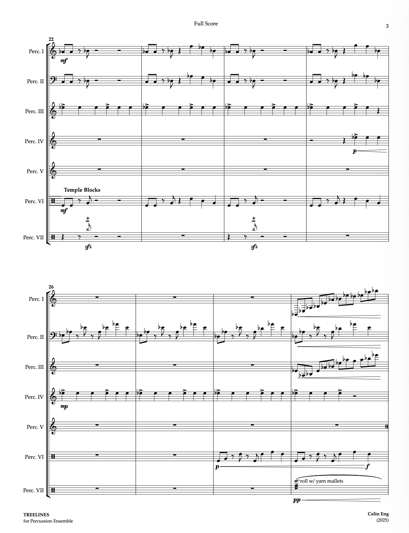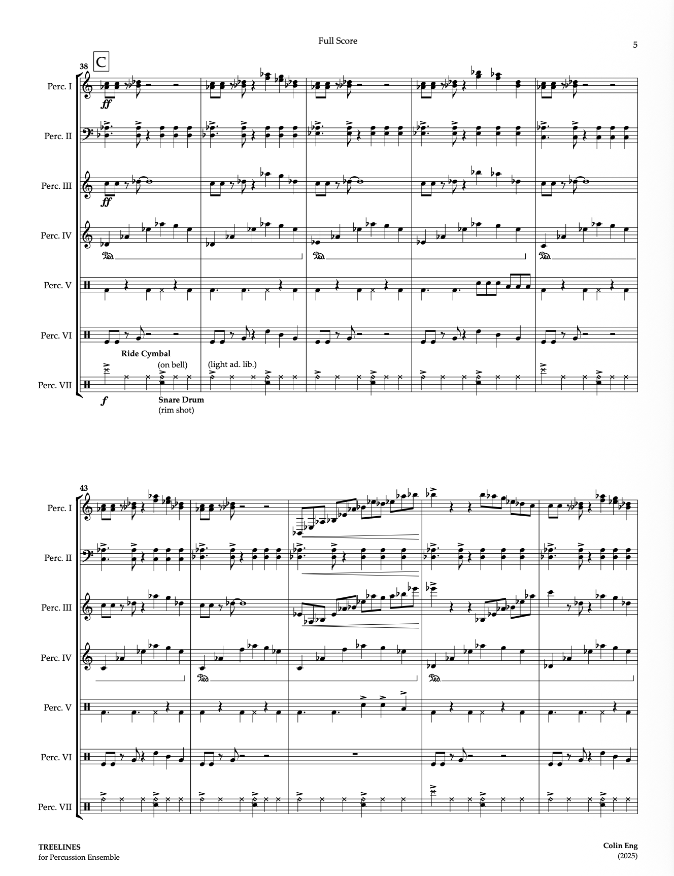 Over the summer, I have had the privilege of working as a college intern at the Ellicott City Summer Band Camp. The camp is mostly made up of younger, elementary or middle school students working on their fundamentals, however there is also a huge group of high school counselors that help teach the students. The percussion counselors are extra special because at the concert, it has become a tradition for them to perform a percussion ensemble piece. After writing my last percussion ensemble piece, my good friend and the college intern for the percussion section, Hwanee Pak, asked me to write their percussion ensemble piece for the concert. While writing the piece, I found myself staring out my window a lot for inspiration. In my backyard is a large wooded area and a creek where the trees stretch up tall. In this piece I really tried to capture the experience of getting lost in watching those TREELINES. I add some cool sparkly, shimmering effects in the crotales and triangles to make it feel like porch chimes, wind blowing, and the leaves rustling.